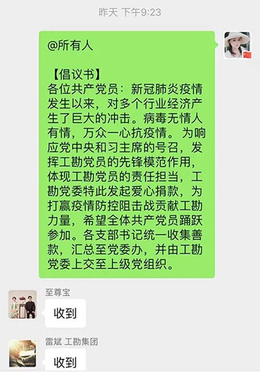 為響應(yīng)黨中央號(hào)召,2020年2月26日晚,工勘集團(tuán)黨委迅速行動(dòng),向黨員發(fā)出“抗擊疫情擔(dān)使命,凝心聚力黨旗紅”的倡議,鼓勵(lì)黨員自覺(jué)自愿捐款,為支援新冠肺炎疫情防控工作貢獻(xiàn)工勘力量。